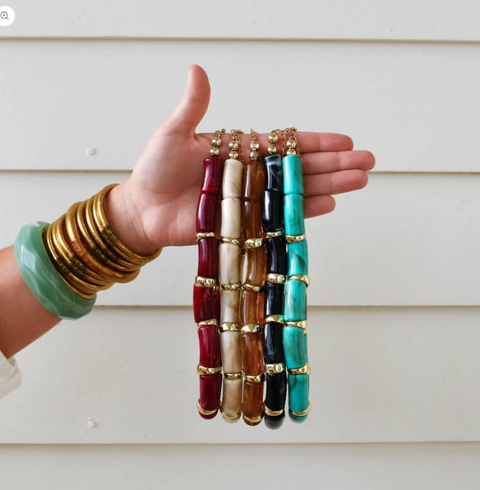 - Featuring glossy marbled beads accented with shiny gold spacers.