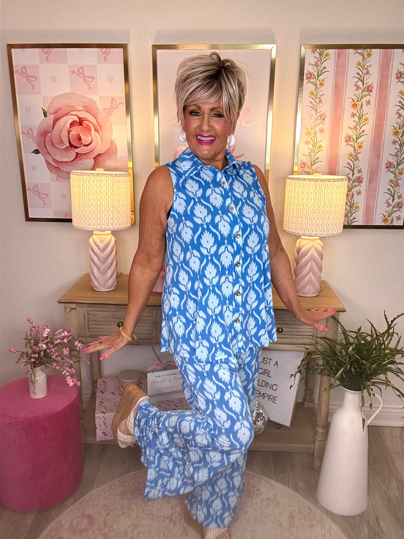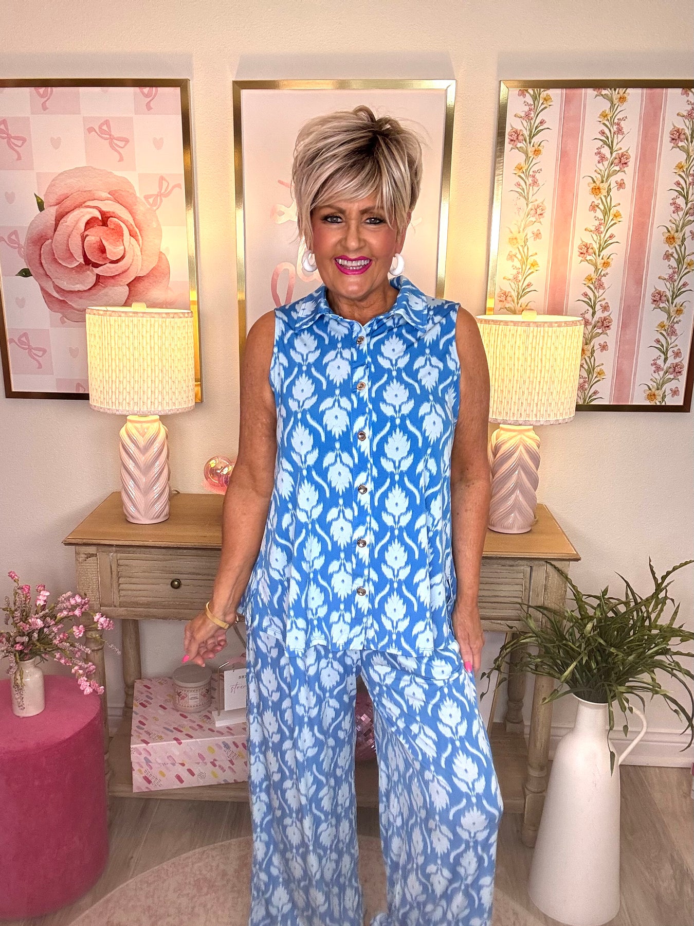 This stylish two-piece set is perfect for warm summer days or your next getaway. Featuring a sleeveless blouse with collar detailing and relaxed, loose-fitting pants, it combines comfort and effortless style. Thoughtful button details complete the look for a polished, put-together outfit.