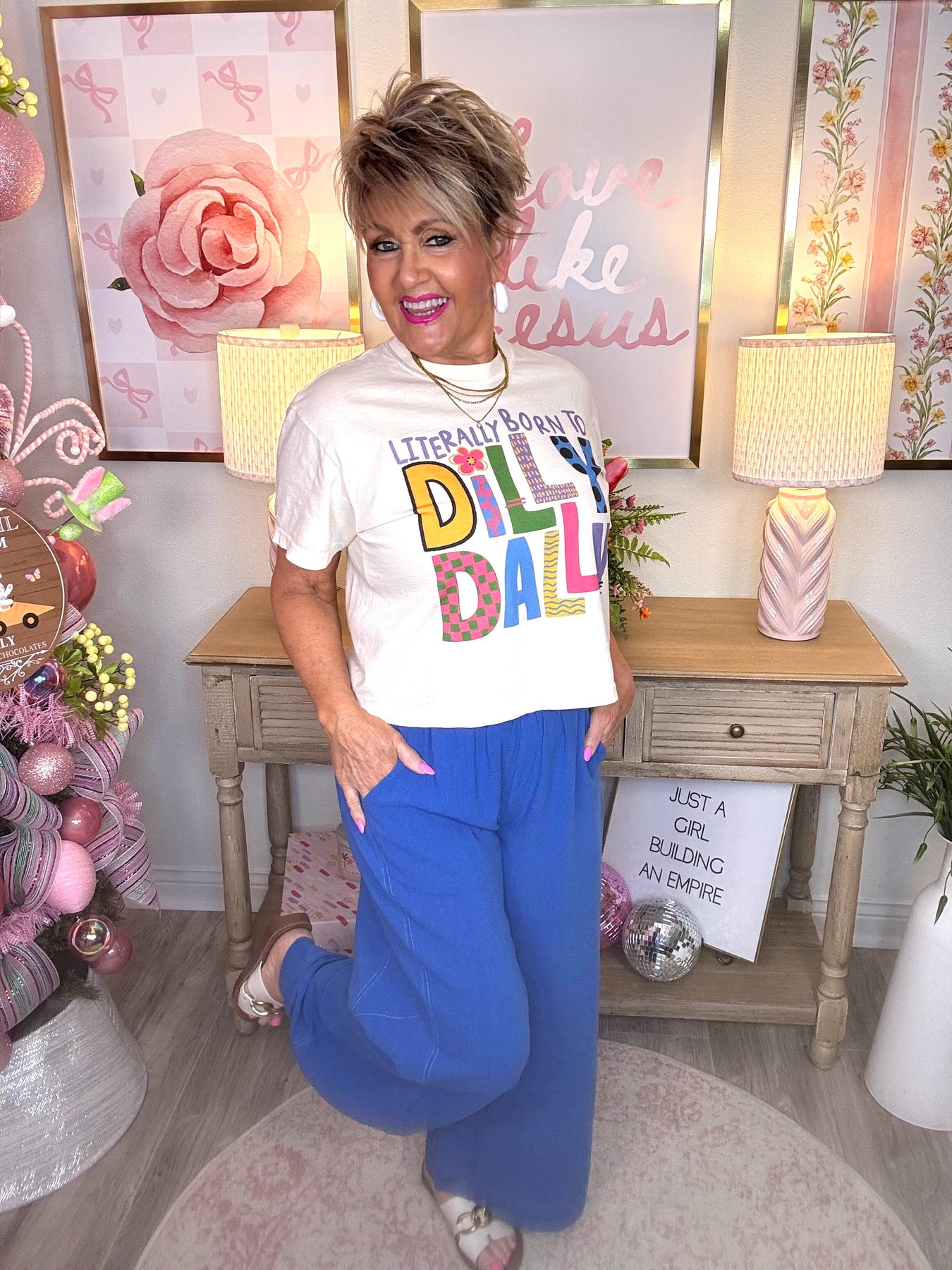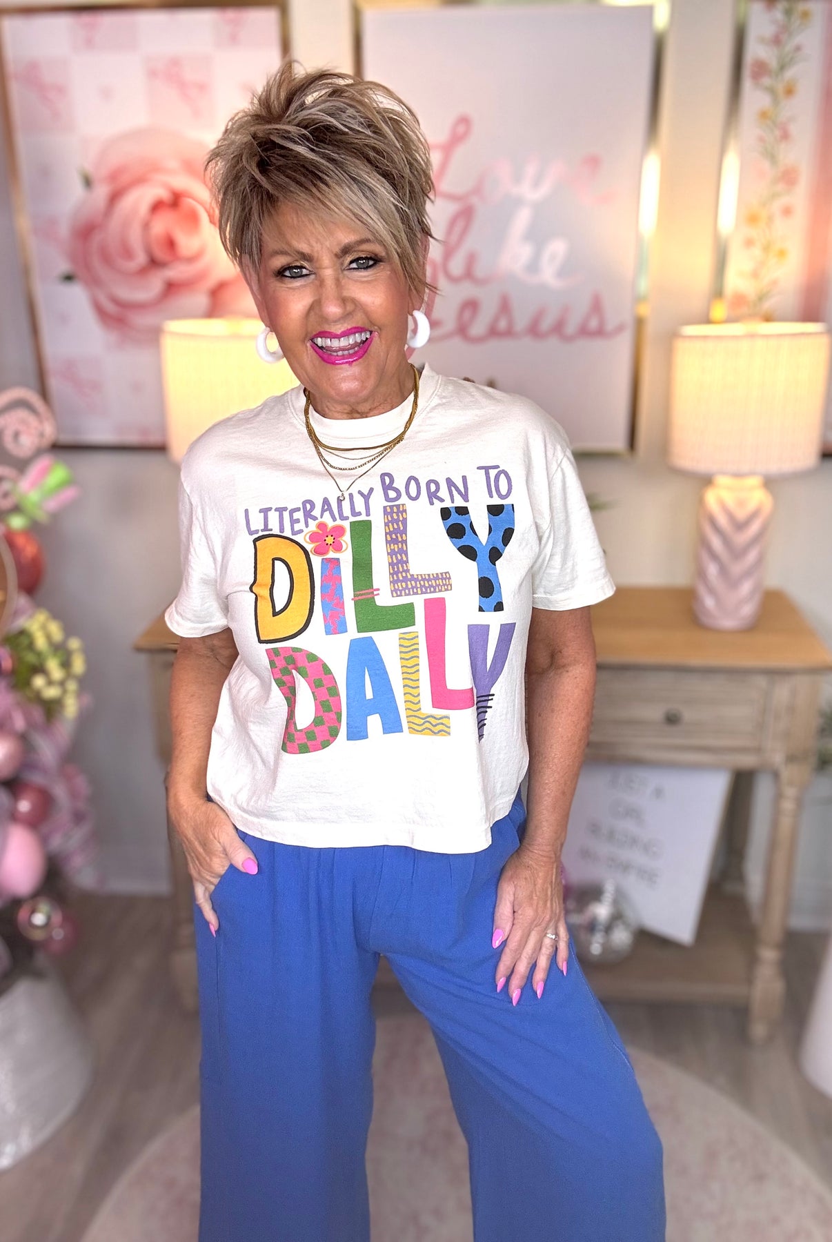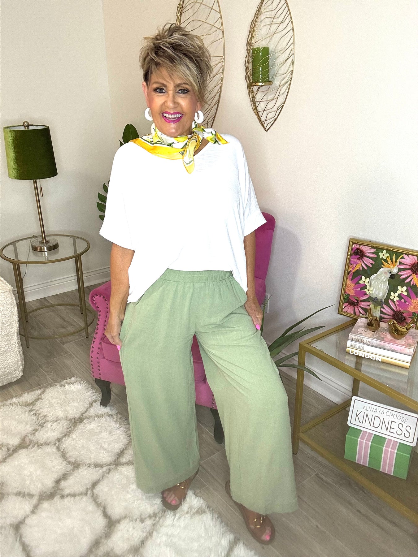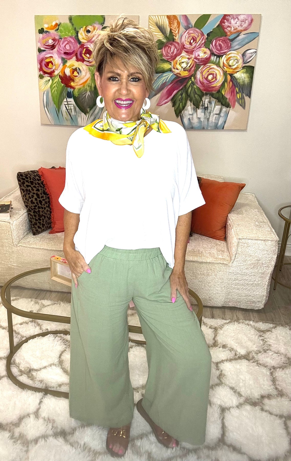 Oh, Hello Spring! Get started on those cute pants for work, play, church, outings, events, and yes, vacation! Amazing that a pair of pants could be suited for any occasion. Wear them casual or dressy! Love the cute detailed stitching! Libby would wear a small.