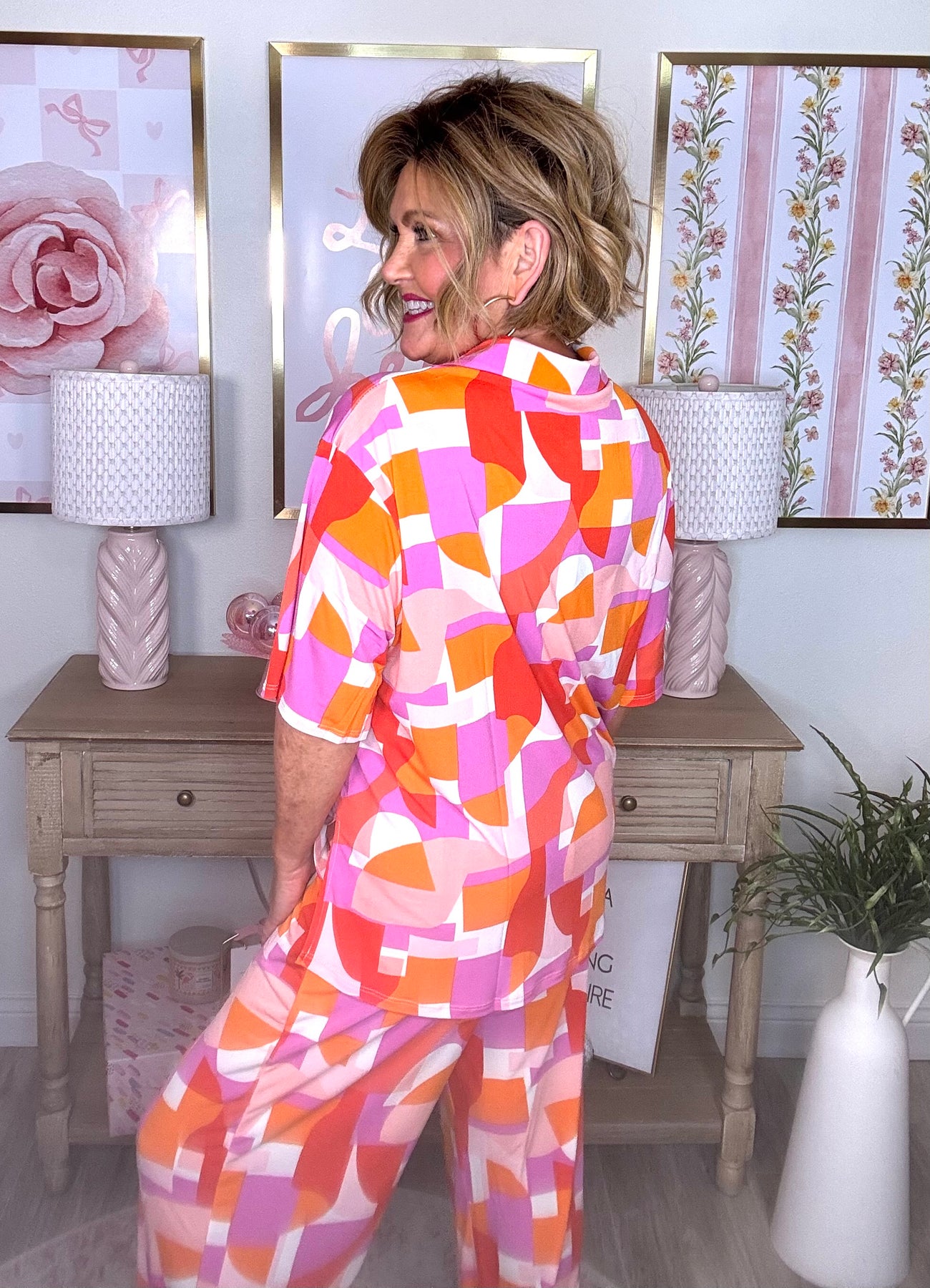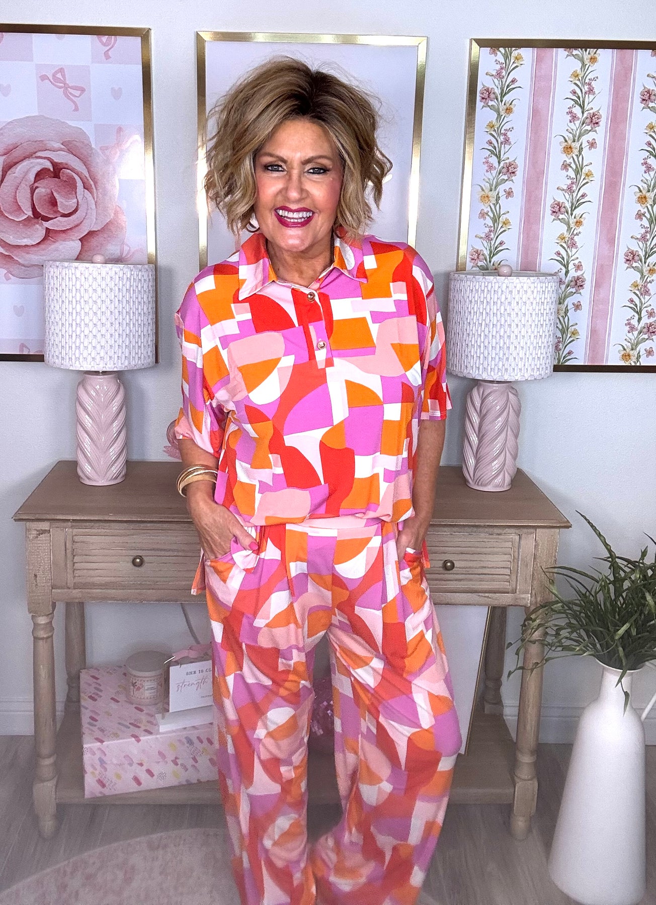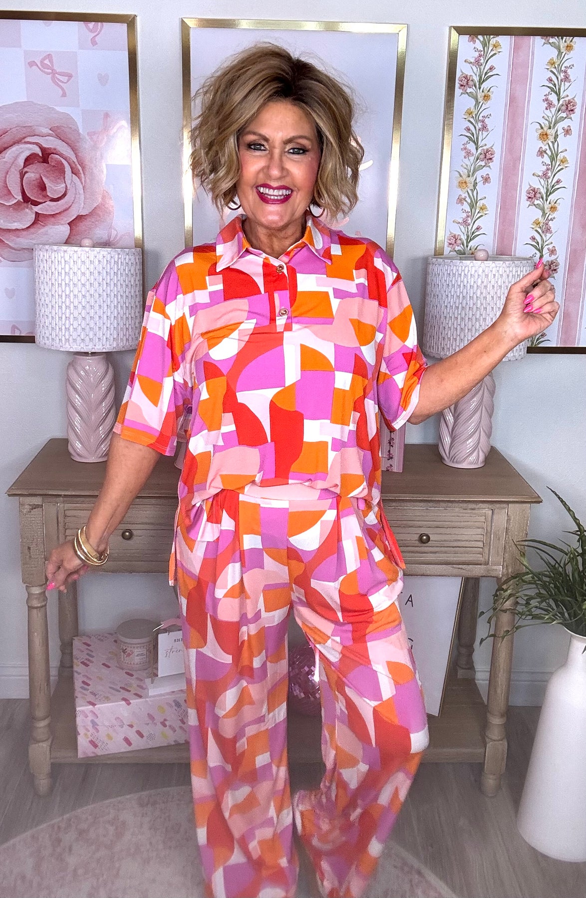Chic and classy, this two-piece set features a relaxed blouse with short sleeves and placket detailing, paired with bottoms that showcase elegant pleats for an extra-special touch. Perfect for effortless style on warm days or special outings.