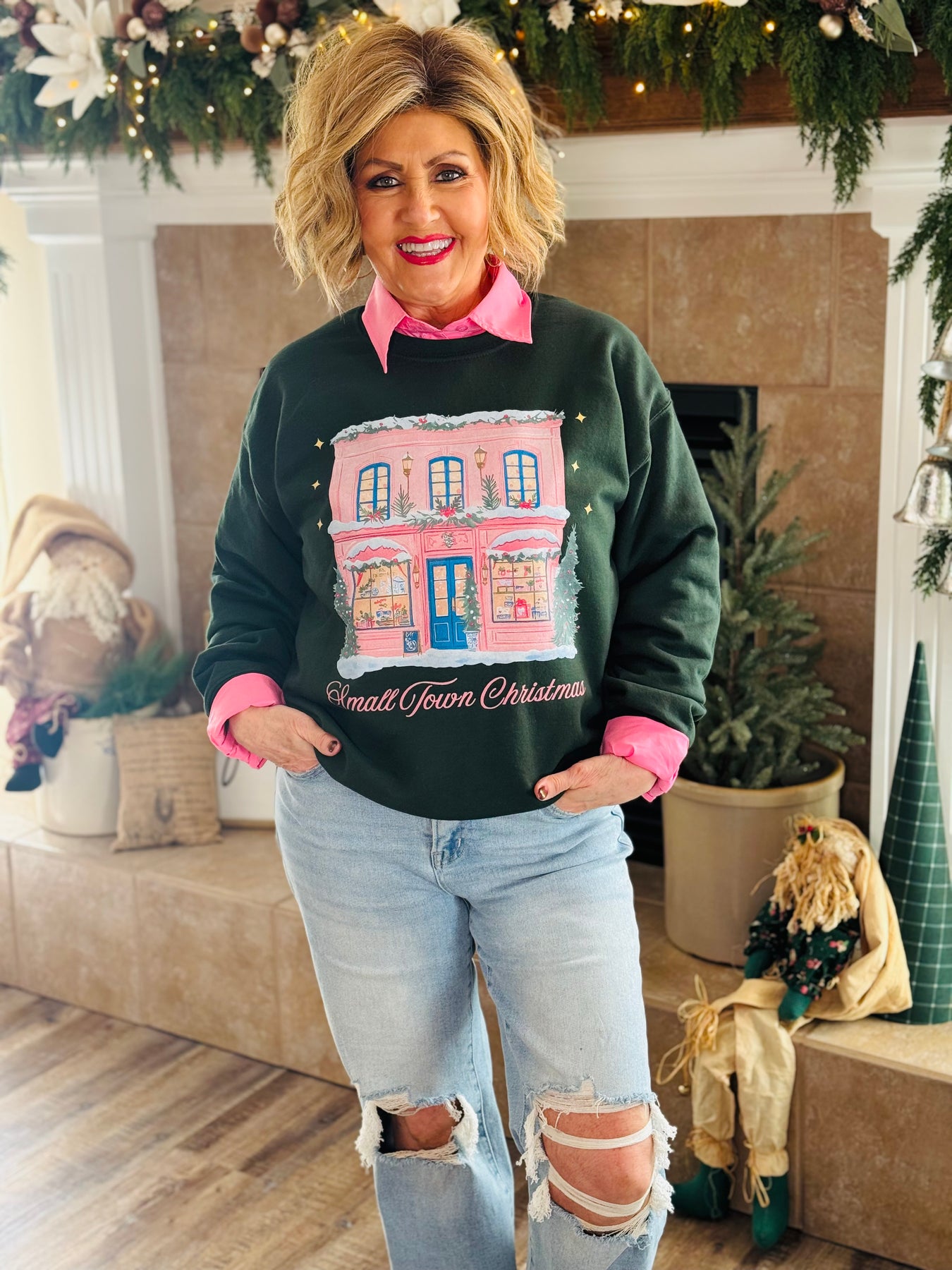 Embrace cozy holiday charm with this Forest Green "Small Town Christmas" Sweatshirt. Featuring delicate pink accents, it captures the nostalgic spirit of old-time Christmas in a warm, stylish design. Perfect for festive gatherings or casual winter days, this sweatshirt adds a touch of vintage charm to your seasonal wardrobe.