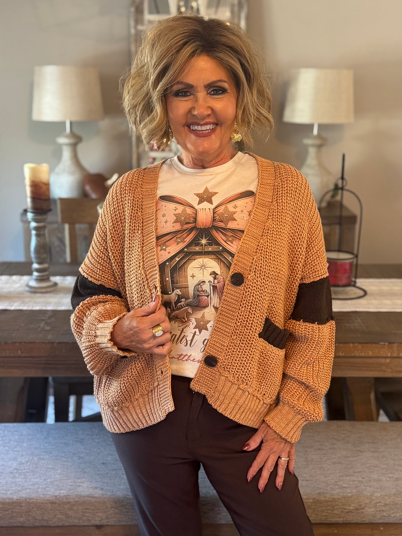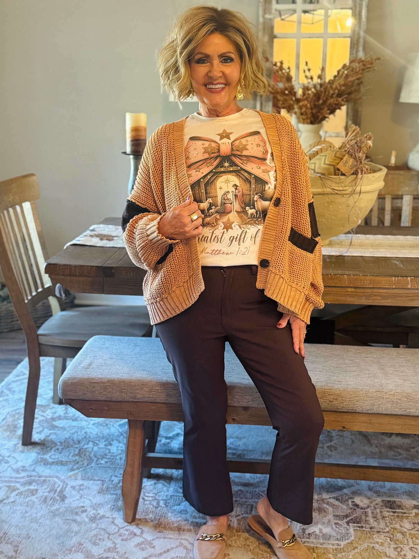 Celebrate the season with "The Greatest Gift Of All" Tee, featuring a charming nativity scene accented by a bold bow and sparkling stars. This festive design beautifully captures the spirit of Christmas, making it a perfect choice to share joy and warmth. Comfortable and stylish, it’s ideal for holiday gatherings or everyday wear throughout the season. Embrace the true meaning of the holidays in a tee that shines as brightly as the story it tells. It also offers the option of sparkling rhinestone details or a clean design without.