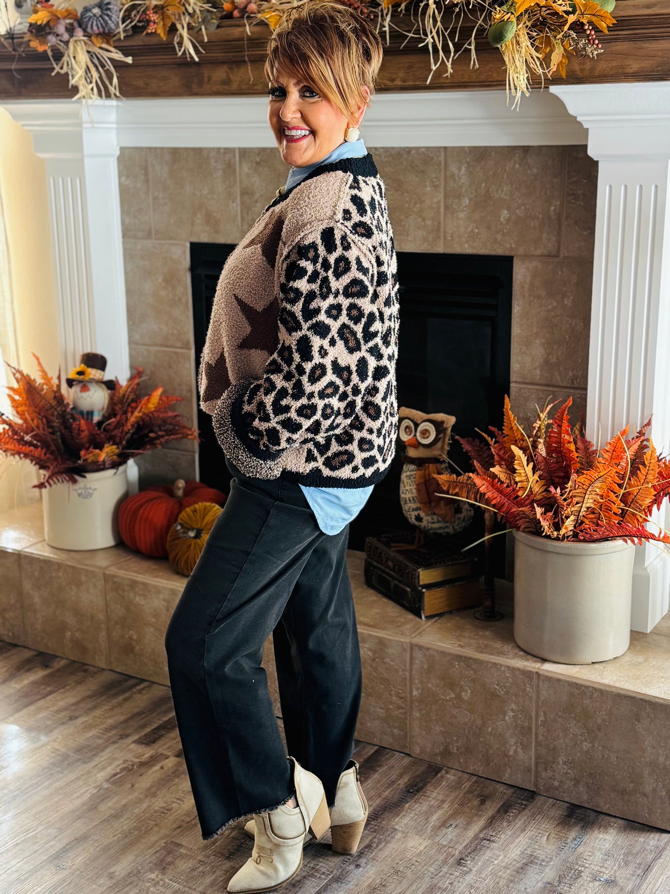Embrace cozy style with this Animal Print Star Pattern Sweater. Its roomy fit ensures comfort all day, while the soft fabric feels so good every time you wear it! Pair it effortlessly with black denim for a chic, casual look that stands out. Perfect for adding a playful yet stylish touch to your wardrobe.